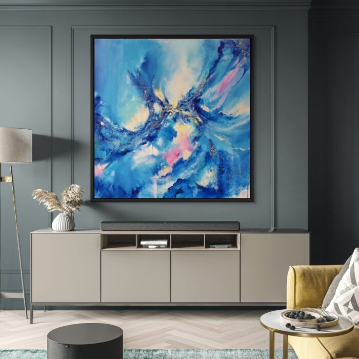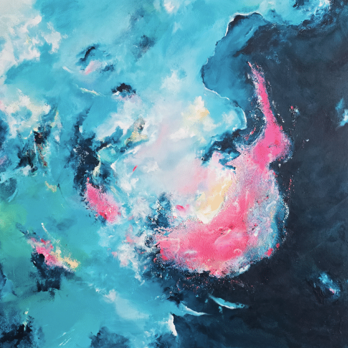 My Ethereal pieces aim to capture life’s contrasts through bold layers of colour and light, colliding in striking texture. Even when life feels hard, they’re a reminder that hope and possibility still shine through. This piece consists of blues with highlights of pale yellows and pinks.
