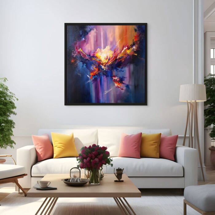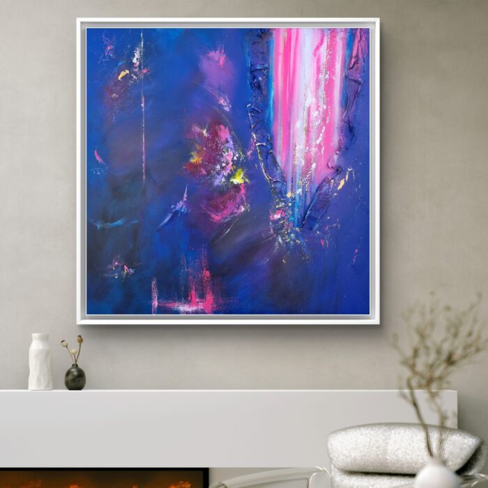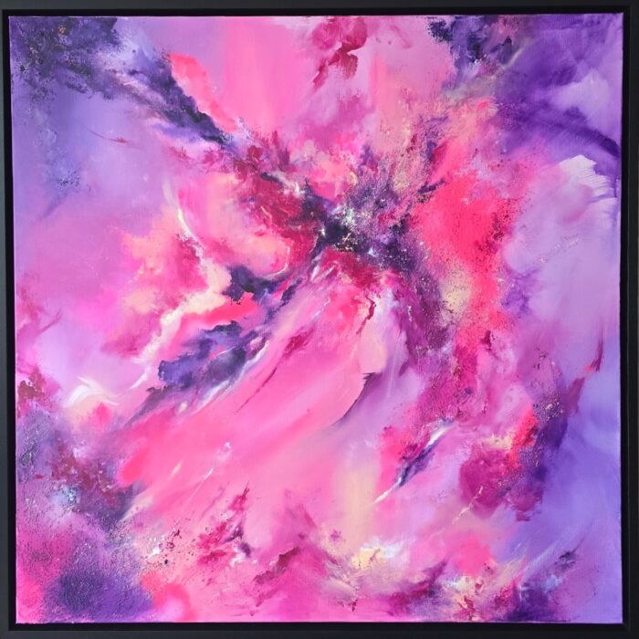 My Ethereal pieces aim to capture life’s contrasts through bold layers of colour and light, colliding in striking texture. Even when life feels hard, they’re a reminder that hope and possibility still shine through. This piece incorporates darker reds, purples, and blues that contrast beautifully against the pops of yellow and white. A powerful statement piece.