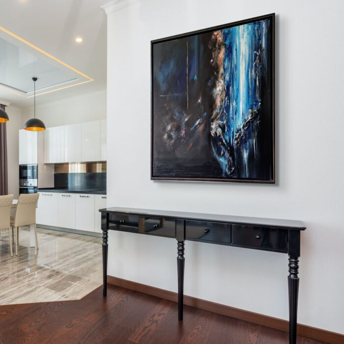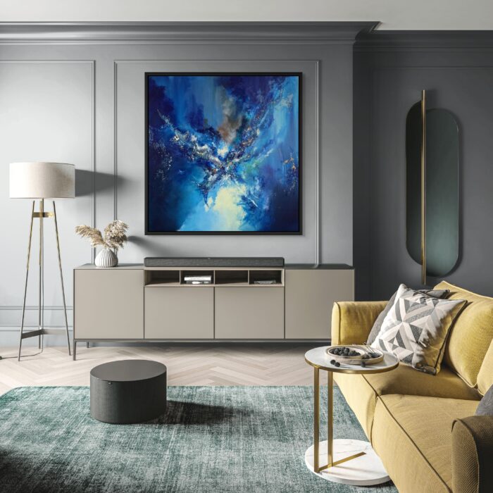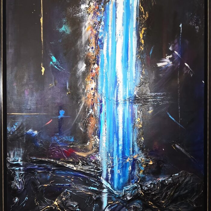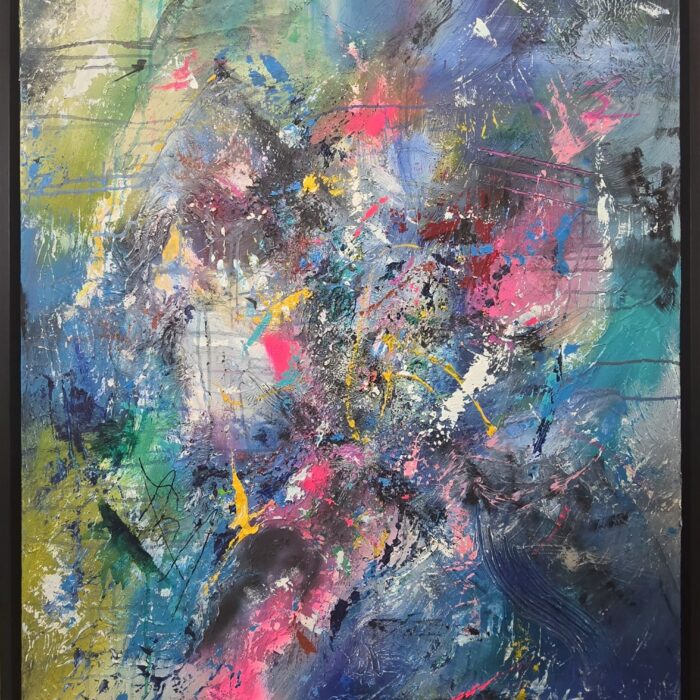 These Ethereal pieces aim to capture life’s contrasts through bold layers of colour and light, colliding in striking texture. Bold colours dance across the canvas, so even when life feels hard, they’re a reminder that hope and possibility still shine through. Predominantly blue tones, lifted by pops of green, yellow.