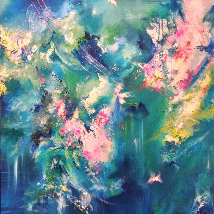 My Ethereal pieces aim to capture life’s contrasts through bold layers of colour and light, colliding in striking texture. Even when life feels hard, they’re a reminder that hope and possibility still shine through. This piece consists of greens and teals with striking elements of neon pink and airbrush work. This is about finding peace in the noise, that sense of calm, even when things might be chaotic.