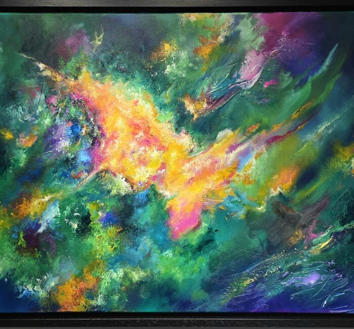 My Ethereal pieces aim to capture life’s contrasts through bold layers of colour and light, colliding in striking texture. Even when life feels hard, they’re a reminder that hope and possibility still shine through. This piece consists of greens with bursts of warm yellows and oranges. Full of texture and contrast.
